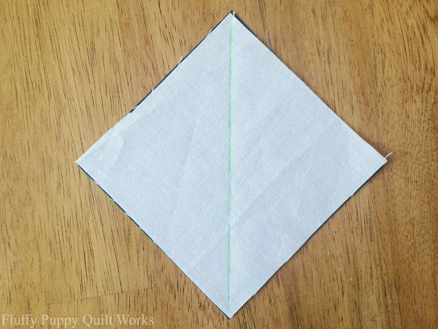Step 2: Make the star points. Lay a HST on one of the larger of the remaining color fabric squares right sides together. Mark a diagonal line along the squares perpendicular to the seam of the HST. Sew 1/4" away from both sides of the line. Refer to the next 4 photos.