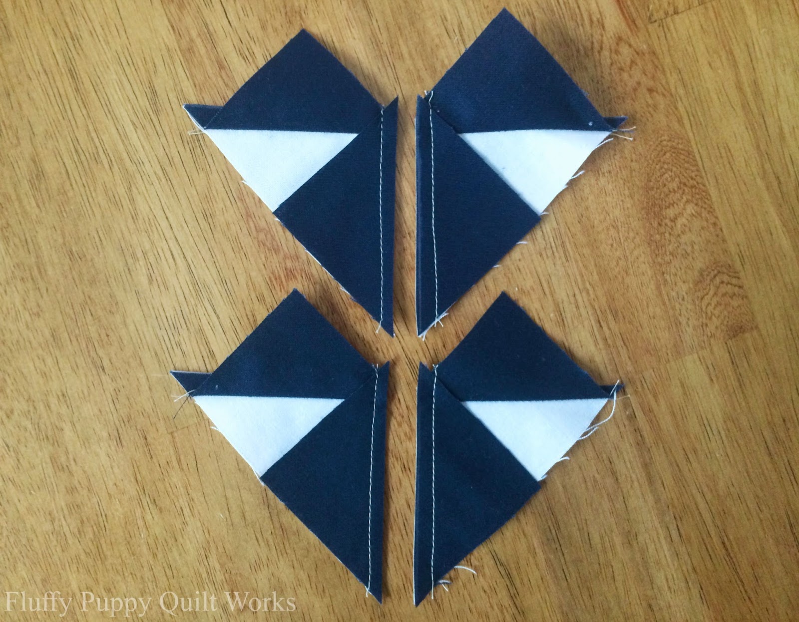 This makes 4 flying geese blocks. The sewing method used is a no waste flying geese block method. You can read more about this method here.